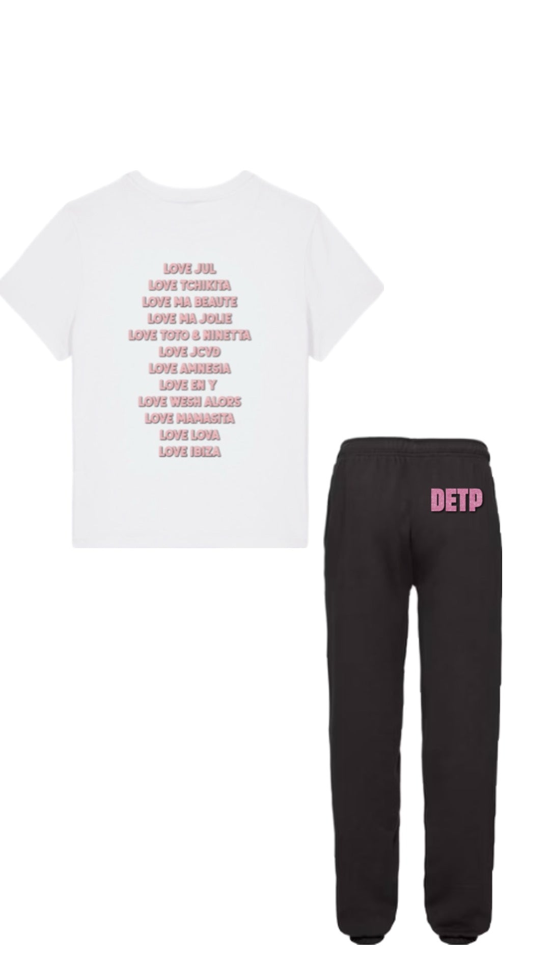Dans ce coffret tu pourras y retrouver un jogging NOIR avec inscription DETP en pailleté rose et le FAMEUX t-shirt "LOVE JUL" blanc avec écriture pailleté rose.